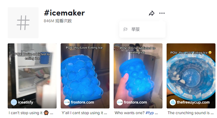 在TikTok标签“#icemaker(制冰器)”下,Shoptop发现,关于这款制冰杯的视频非常多,且流量均不错,除了上述品牌外,还有一些别的品牌也在推广这款产品。